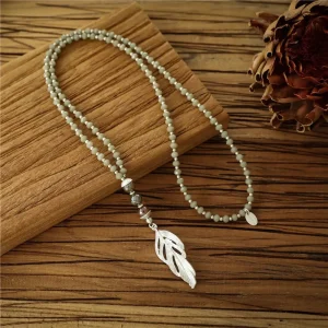 Lange Halskette mit Feder und olivem Achat