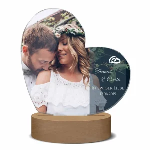 LED Acrylbild Herz mit Deinem Foto & Wunschtext – inkl. Beleuchtung & Holzsockel (rund) – 14 x 13,5 cm