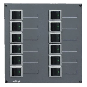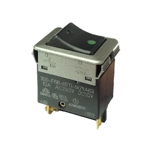 Zweipoliger DC Ein-Aus-Wippenschalter mit grüner LED-Anzeige. Befestigungsausschnitt 26,3 x 34,2 mm, Gerätebreite 29,5 mm, Nennspannung DC 30 V, Nennstrom 0,1…16 A. Stromaufnahme der LED: 0,7 mA bei 12V.