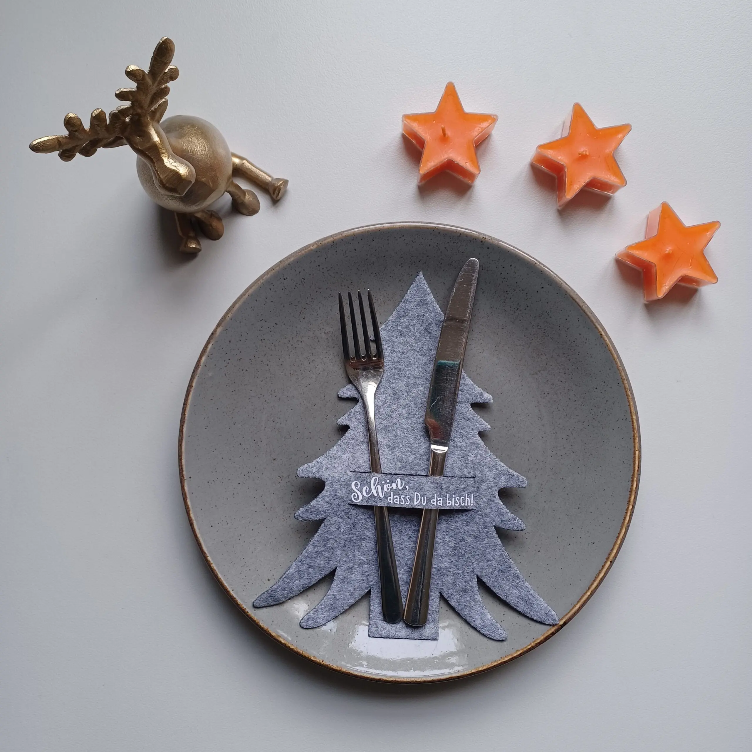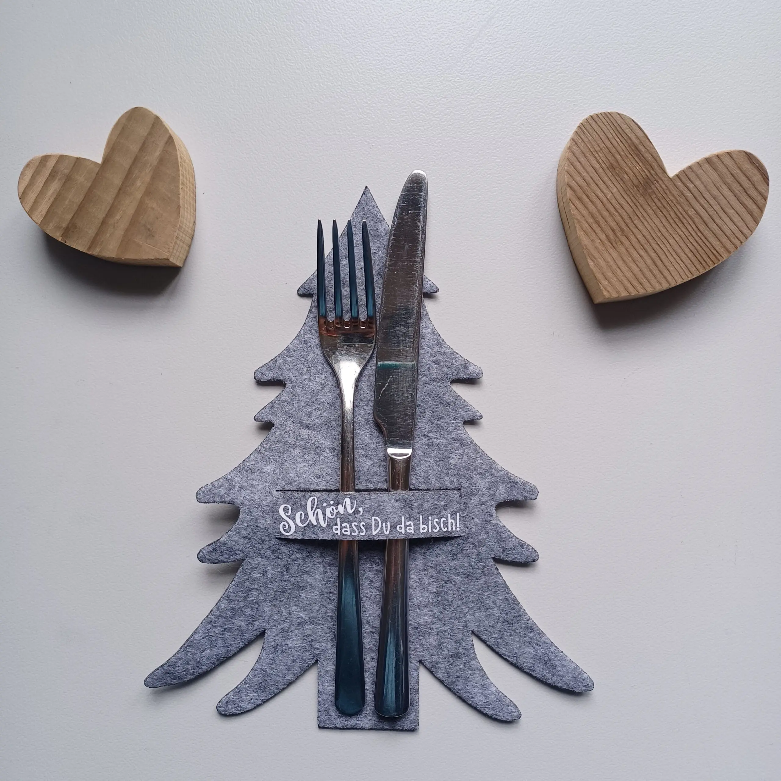 Die Besteckhalter aus Filz in Tannenform mit dem Aufdruck “Schön, dass Du da bisch!” verschönern jeden Esstisch. Sie sind 23cm hoch und 19cm breit.