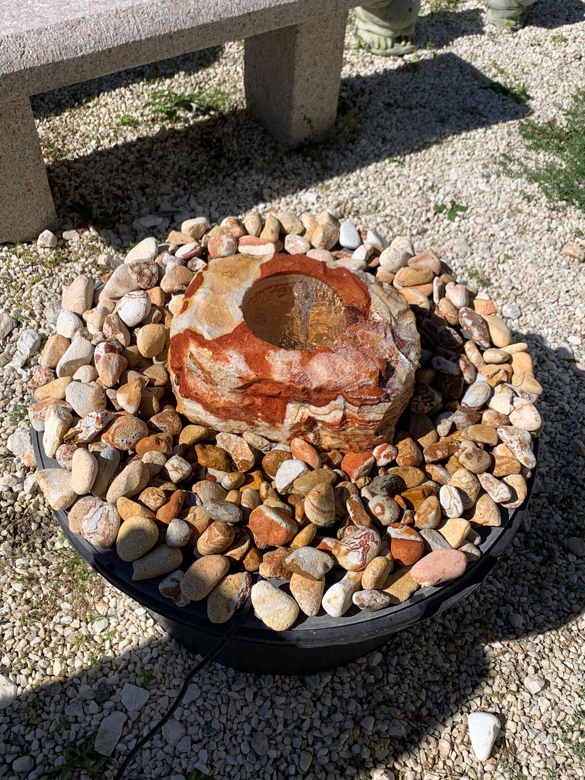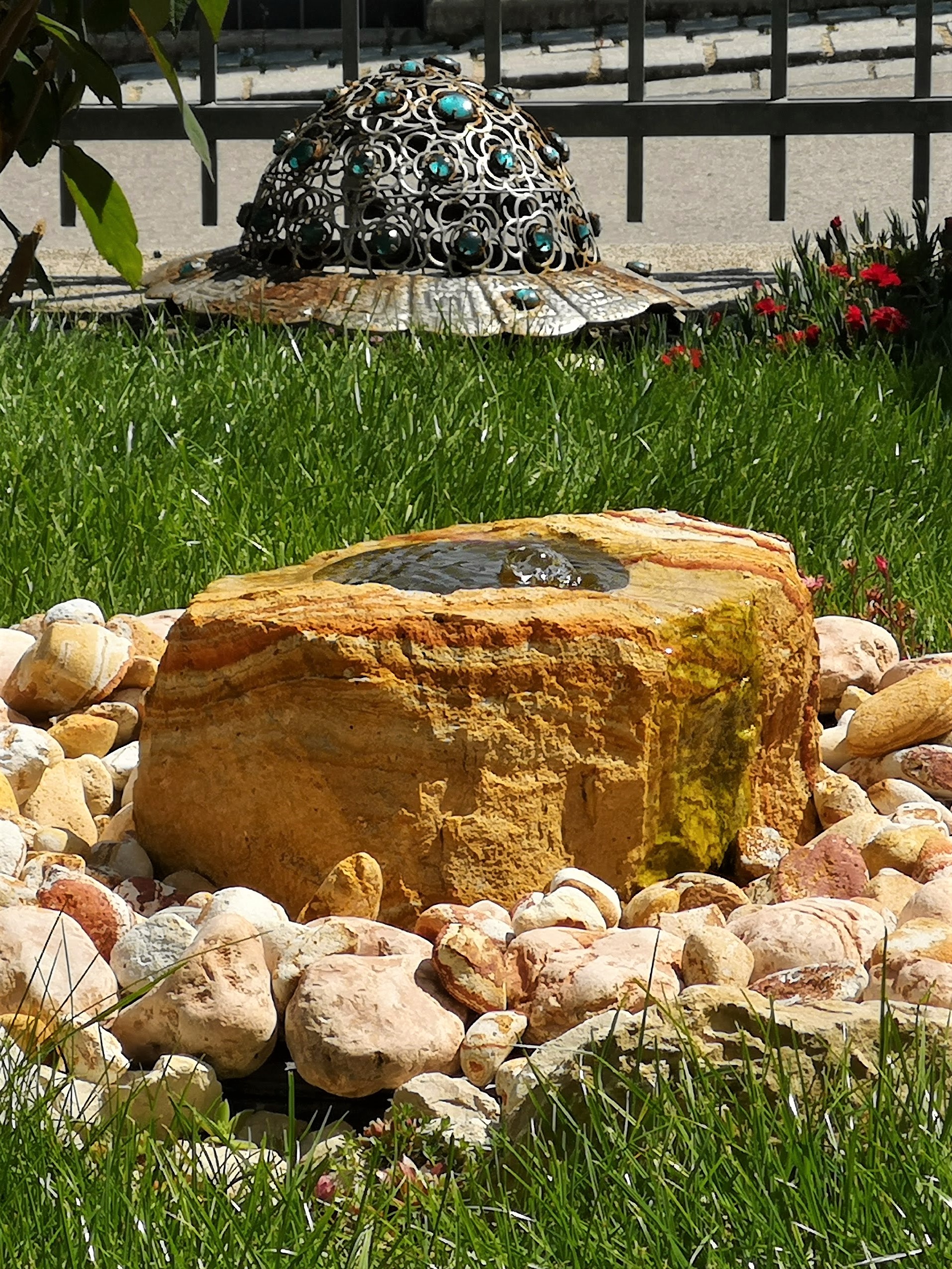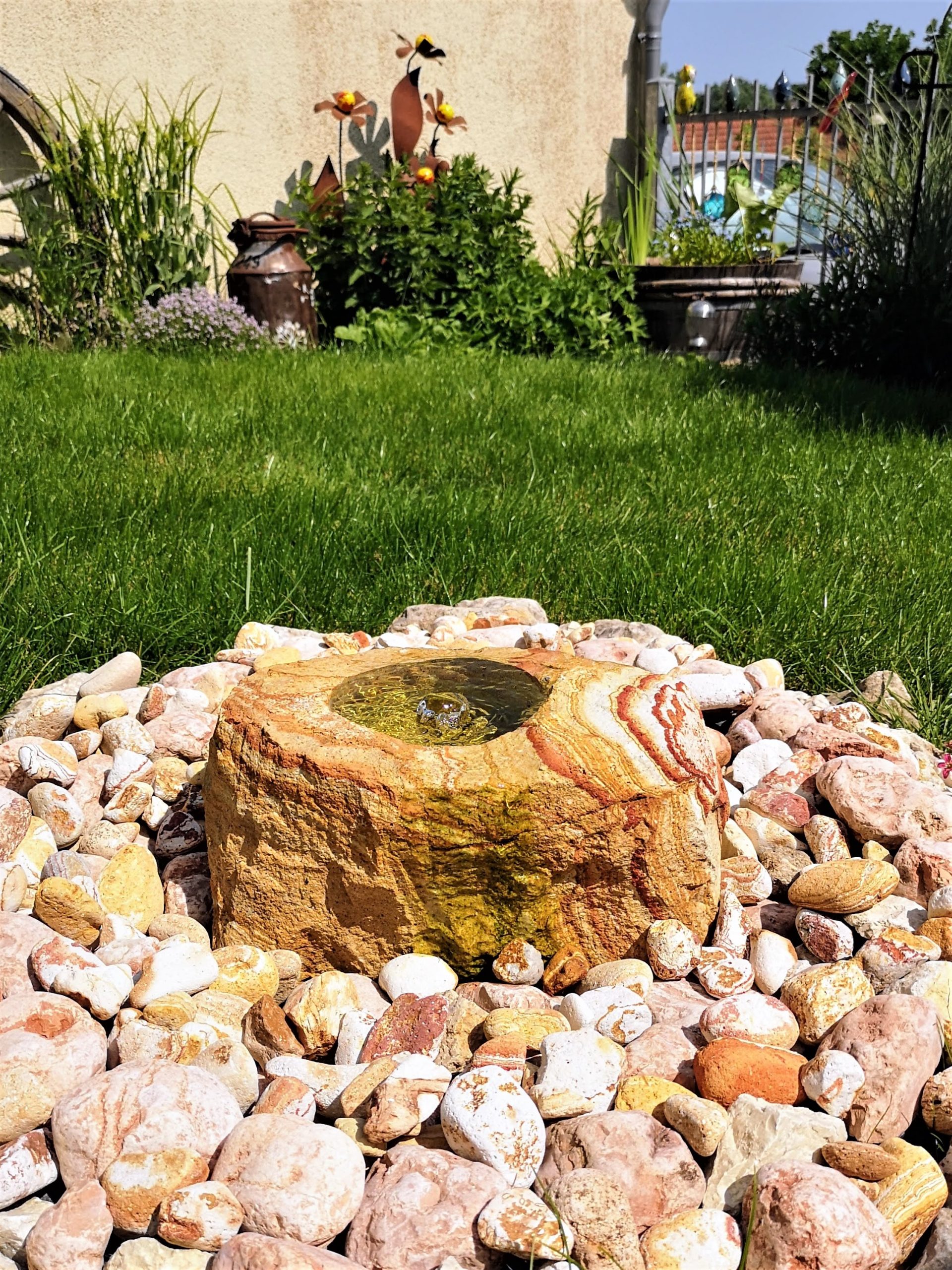 Hauptdarsteller dieses schönen kleinen Gartenbrunnens ist ein naturbelassener Sandsteinfelsen* mit einem kleinen See und einer lebendig sprudelnden Quelle in der Mitte. Das sprudelnde Wasser stürzt in den kleinen Teich inmitten des dekorativen Sandsteins und verursacht somit kaum Spritzwasser.