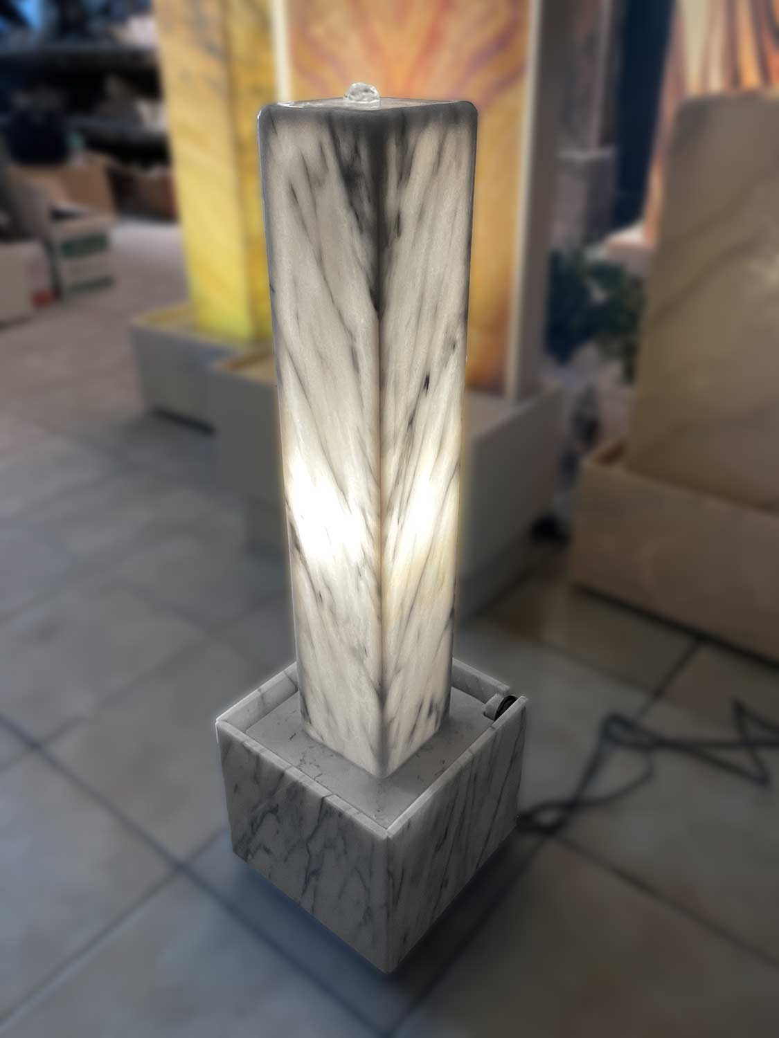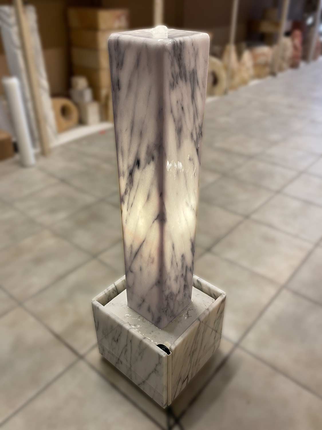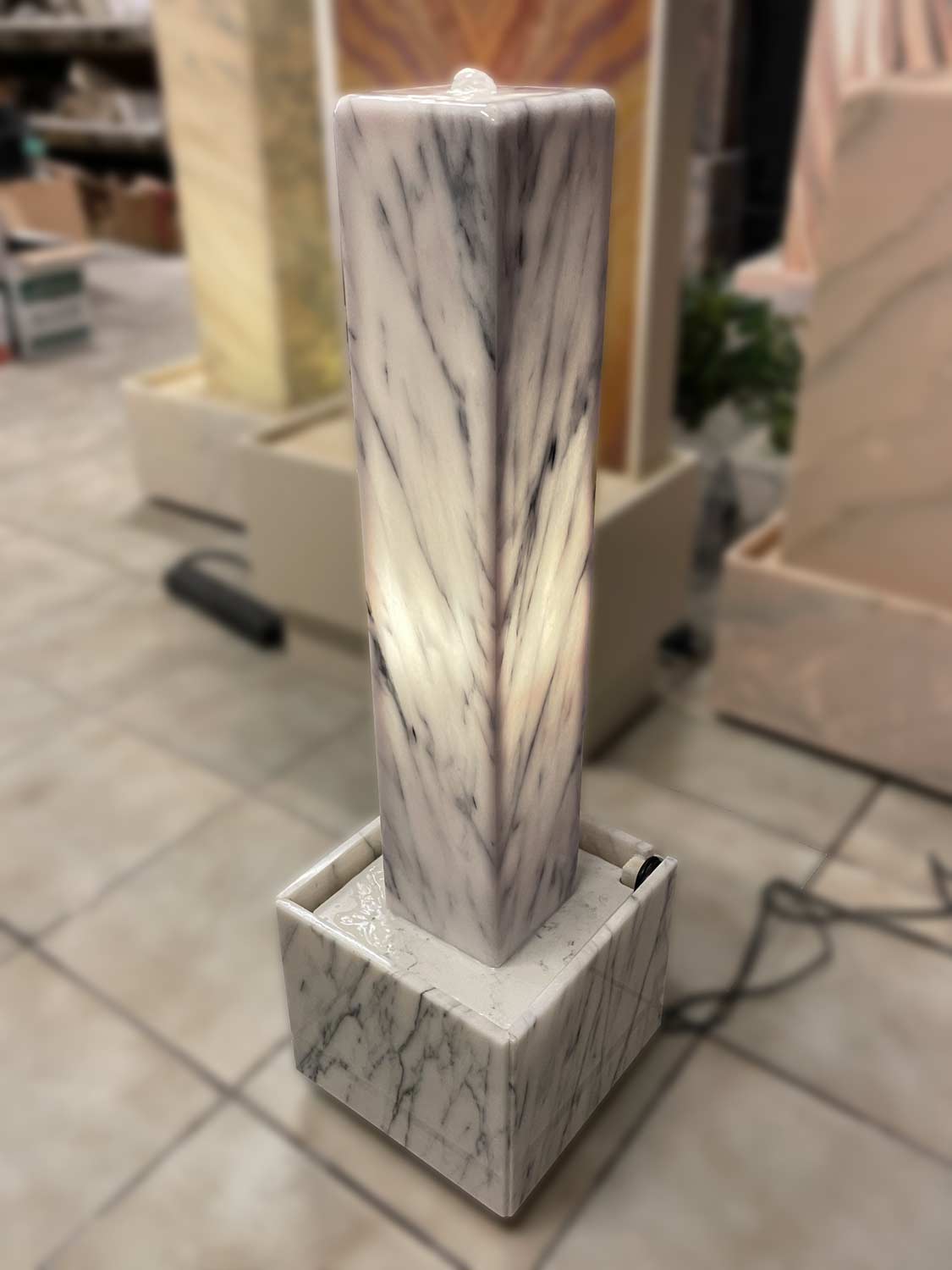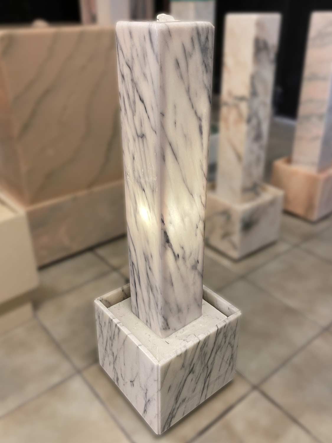 Dieser Lichtstelen-Brunnen ist aus dem edlen Marmor “Estremoz Claro Blanco” (Herkunft: Portugal) gefertigt. Die Marmor-Hohlstele, welche von Innen mit einem LED-Licht beleuchtet wird, sowie die dazugehörige Wanne werden in liebevoller Handarbeit in unserer hauseigenen Werkstatt gefertigt.