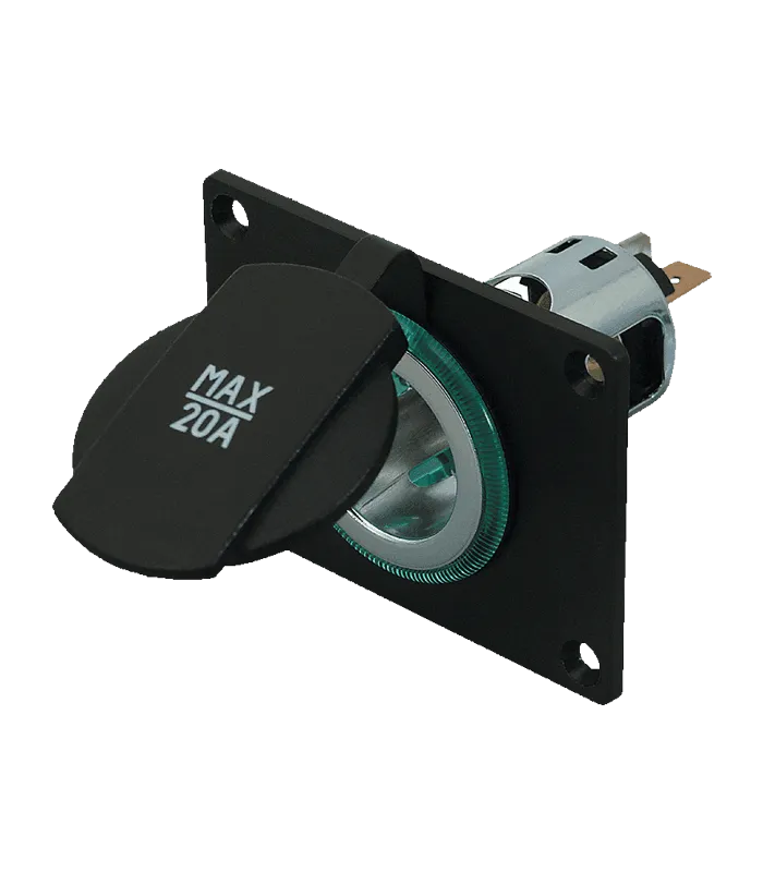 Einbausteckdose mit Deckel und Montageplatte. Passend für Stecker Ø 21mm. Strombelastbarkeit 20 A/6-24 V. Anschluss mit Flachsteckern 6,3 mm.