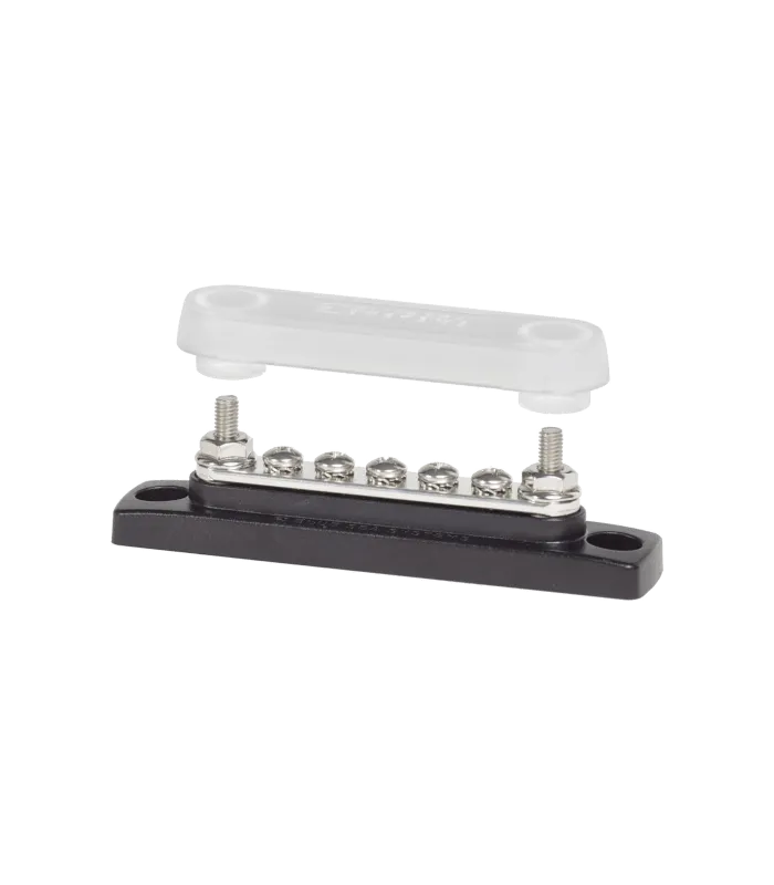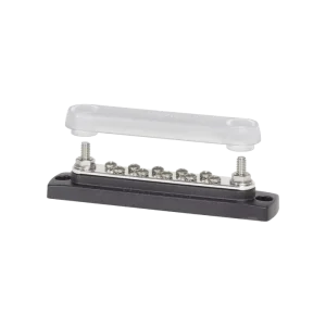 Kompakte Sammelschiene mit 5 Verbraucher- und 2 Zuleitungsanschlüssen. Ideal zum Verbinden der Minusanschlüsse in kleinen Anlagen.