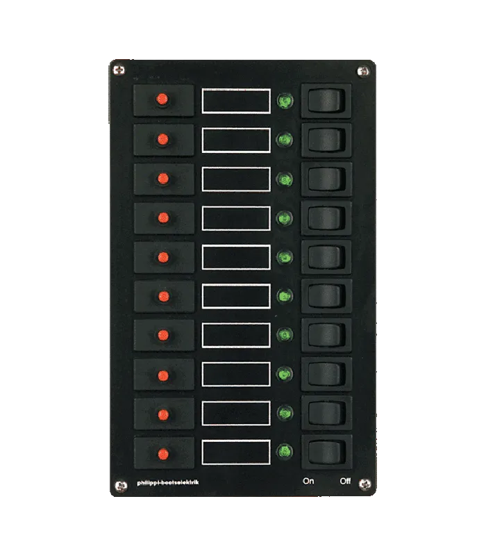 Stromkreisverteiler mit 10 Stromkreisen mit thermischen Sicherungsautomaten der Baureihe E-T-A 1140, Leuchtdiodenanzeige und Wippschaltern, Nennstromstärke 8 A.