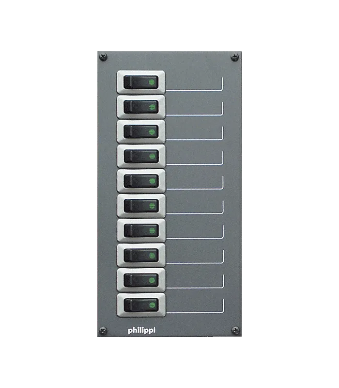 Stromkreisverteiler mit 10 Stromkreisen mit thermischen Wipp-Schutzschaltern, Nennstromstärke 10 A.