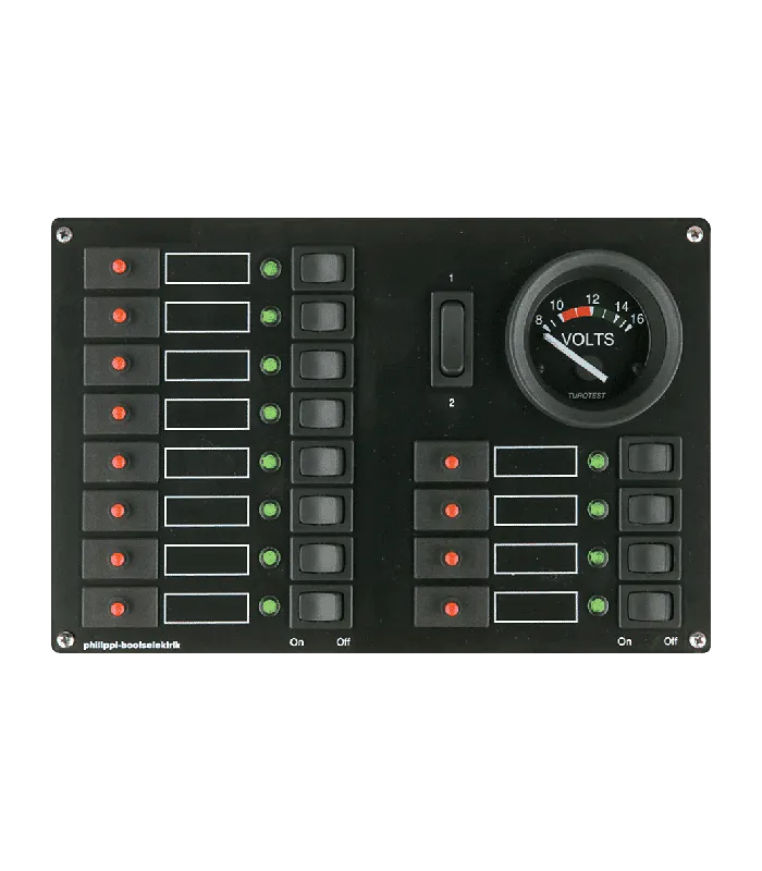 Stromkreisverteiler mit 12 Stromkreisen mit thermischen Sicherungsautomaten der Baureihe E-T-A 1140, Leuchtdiodenanzeige und Wippschaltern, Nennstromstärke 8 A.