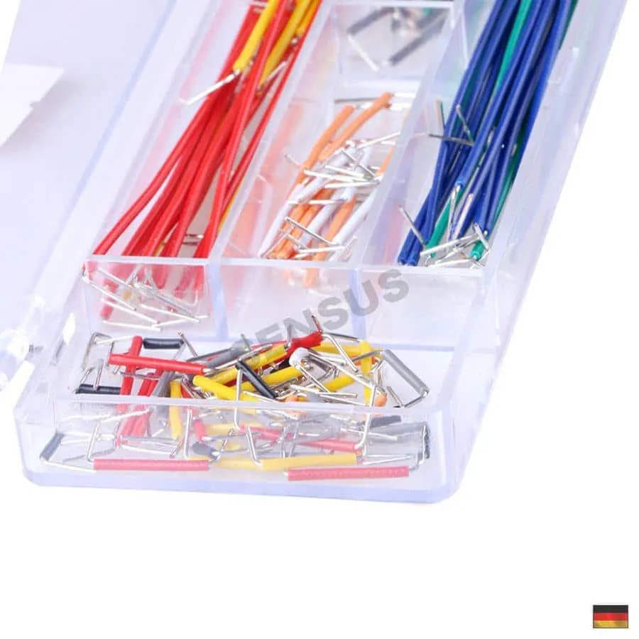 Praktisches Drahtbrücken Set bestehend aus 140 Teilen in ABS Plastikbox. Zur einfachen und sauberen Verdrahtung von eigenen Projekten auf Breadboards und Laborsteckboards.
